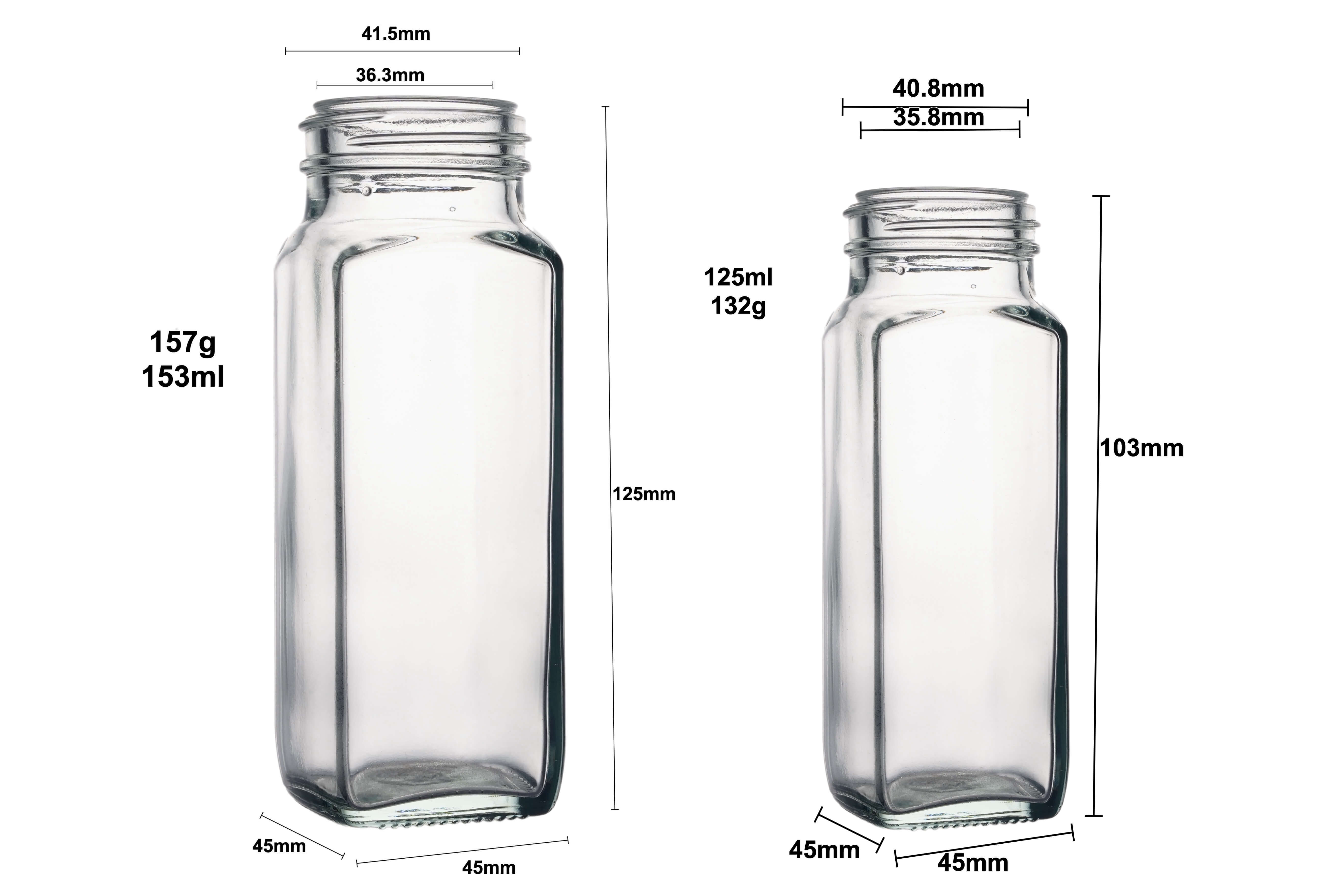 125ml和150ml的调味品瓶是用玻璃制成的,很厚。香料一目了然。顶部均匀有小孔,可以用来控制盐、糖、胡椒粉等小颗粒调味品的用量。